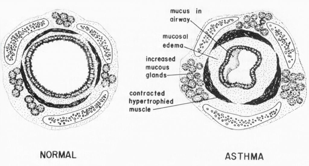 L’augmentation de la résistance des voies aériennes est due à une contraction des muscles lisses bronchiques, à un œdème de la muqueuse bronchique, et à l’accumulation de sécrétions.